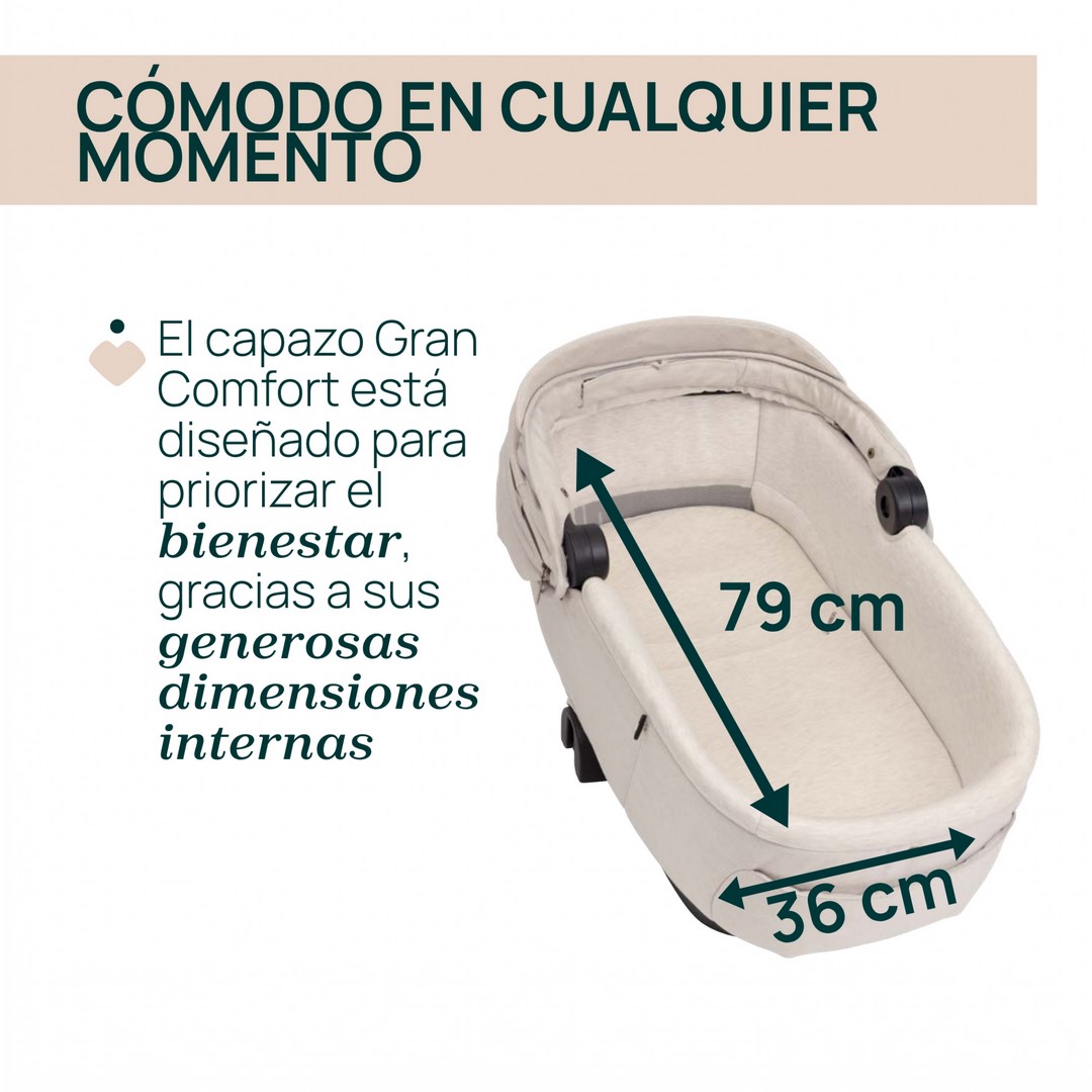 generosas dimensiones internas 79 x 36 cm), crea un espacio acogedor y seguro, para sus primeras siestas al aire libre,haciendo de cada salida una celebración de confort.