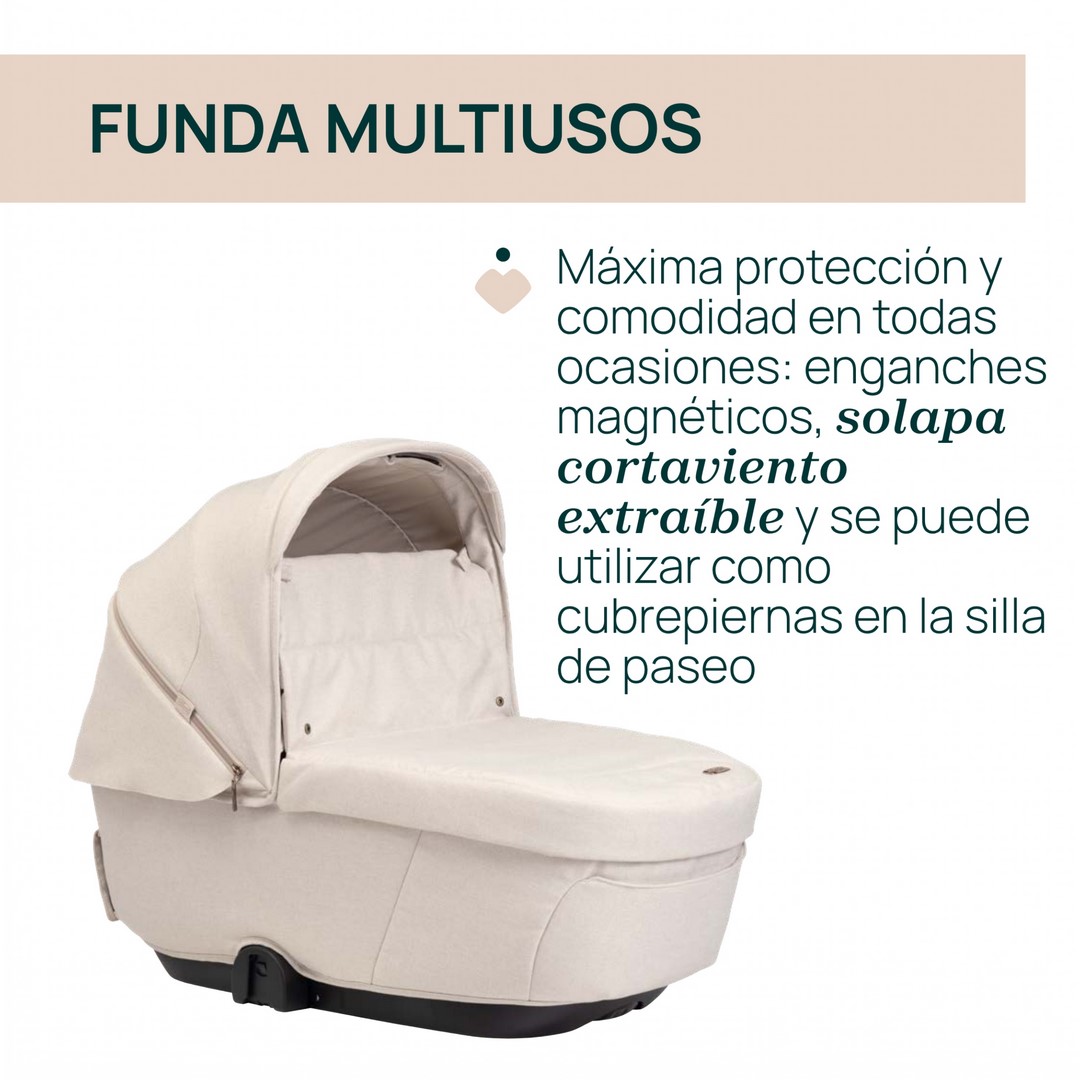 La capota es extensible y está equipada con tratamientos UV50+ e impermeable. Para una protección adicional, el capazo cuenta con un parasol extraíble, que también puede actuar como mosquitera durante los días de verano, gracias a sus inserciones laterales de red.