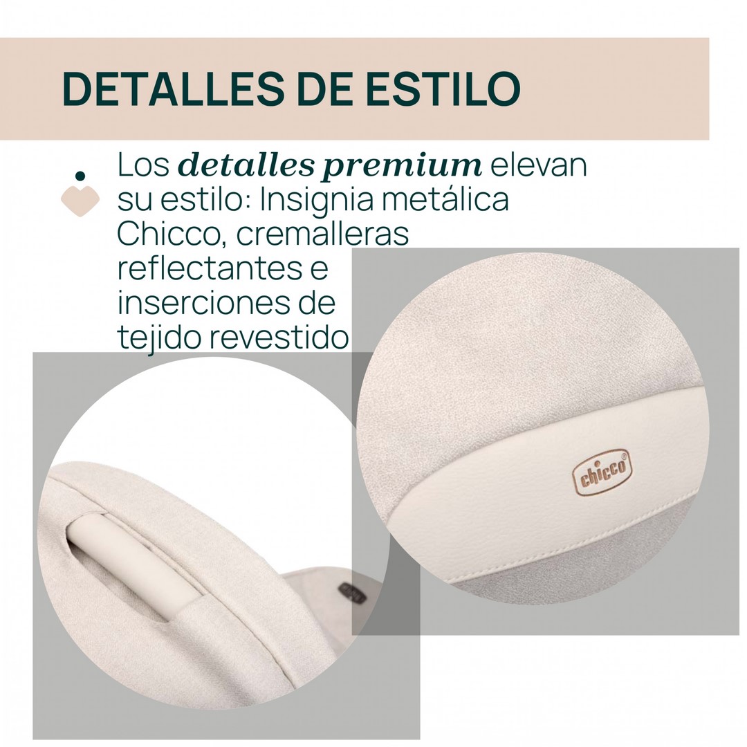 Todo el capazo se enriquece con detalles premium que elevan su estilo. Desde la elegante insignia metálica Chicco, hasta las prácticas cremalleras reflectantes y las inserciones de tejido revestido, disfruta de una mezcla de moda y funcionalidad que te distingue de la multitud.