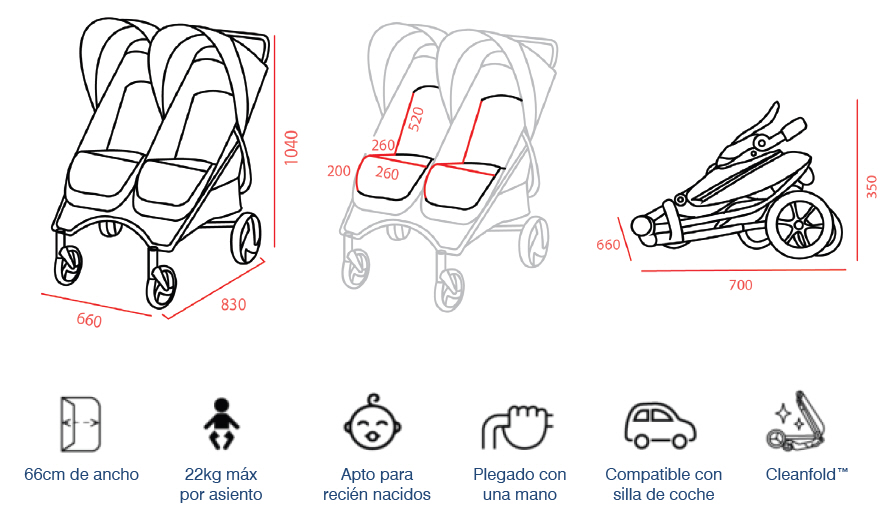• Reposapiés y asientos reclinables independientes: cada bebé, a su ritmo