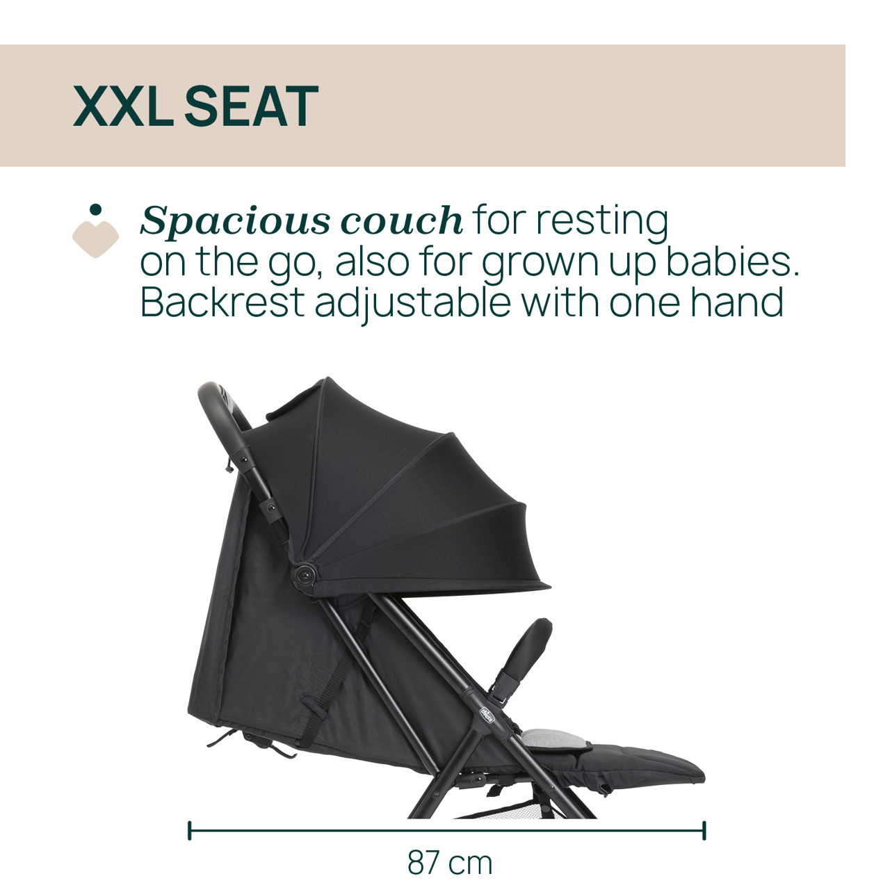 Uno de sus puntos fuertes es su asiento XXL extralargo, que proporciona un espacio amplio para que el bebé pueda viajar cómodo incluso cuando crece. Además, incluye un suave cojín acolchado, ideal para ofrecer mayor confort durante los paseos y proteger la delicada piel del bebé.