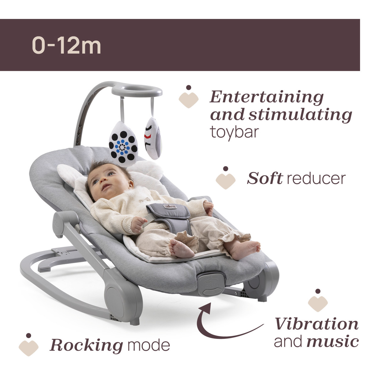 Gracias a su respaldo reclinable en múltiples posiciones, permite ajustar fácilmente la postura del bebé para dormir, relajarse o interactuar con su entorno. Además, puede utilizarse tanto en modo fijo como en modo balancín, proporcionando un suave movimiento que ayuda a calmar al bebé de forma natural.